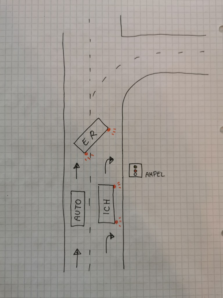 Es war so: Ich befand mich auf einer zweispurigen Straße und reihte mich rechts ein, um abzubiegen. Die Ampel schaltete auf rot und ich rollte langsam auf den Haltestreifen neben der Ampel zu.